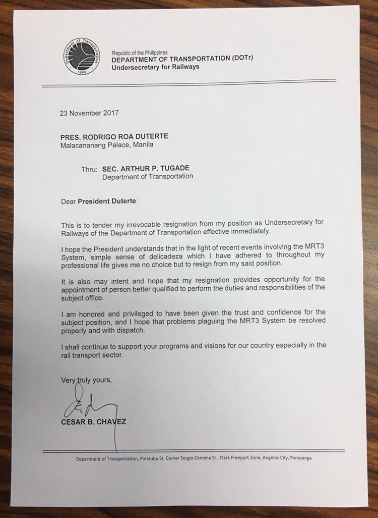 Department of Transportation Undersecretary for Rails Cesar Chavez has tendered his "irrevocable" resignation amid problems hounding the Metro Rail Transit system.
